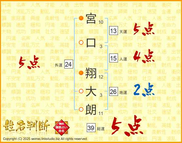 宮(10画)口(3画) 翔(12画)大(3画)朗(11画)