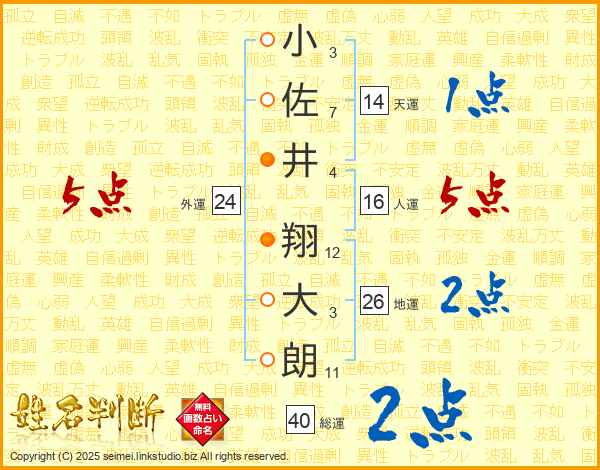 小(3画)佐(7画)井(4画) 翔(12画)大(3画)朗(11画)