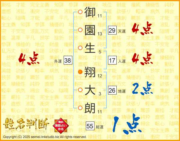 御(11画)園(13画)生(5画) 翔(12画)大(3画)朗(11画)