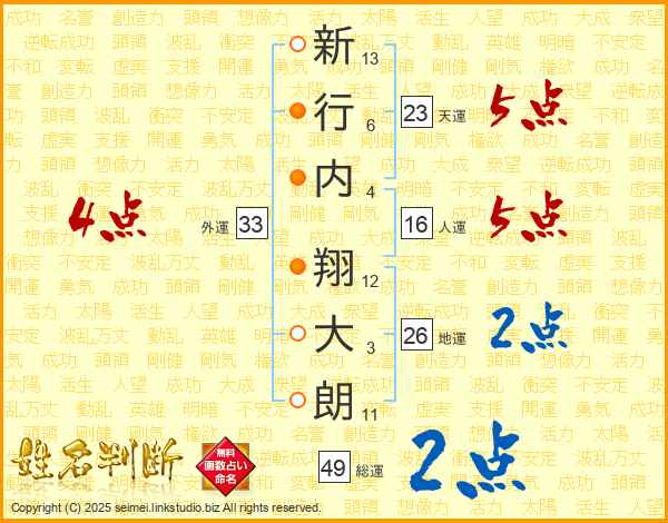 新(13画)行(6画)内(4画) 翔(12画)大(3画)朗(11画)