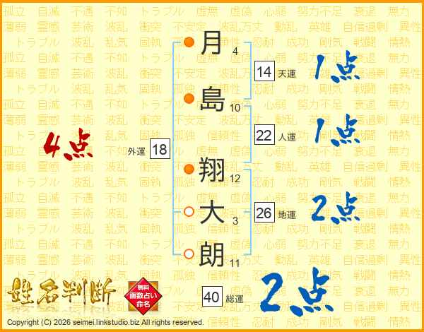月(4画)島(10画) 翔(12画)大(3画)朗(11画)