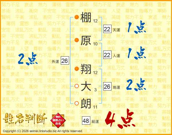 棚(12画)原(10画) 翔(12画)大(3画)朗(11画)