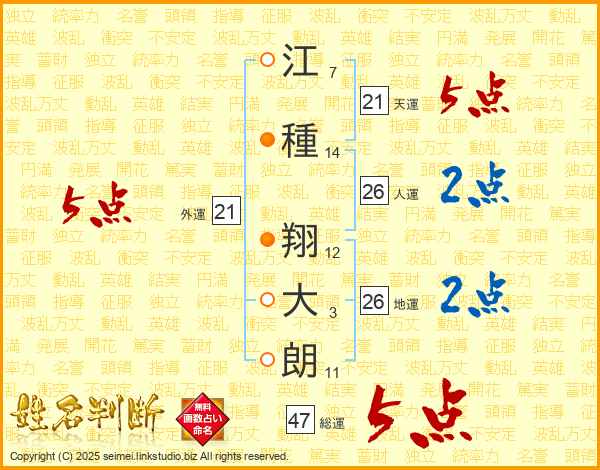 江(7画)種(14画) 翔(12画)大(3画)朗(11画)