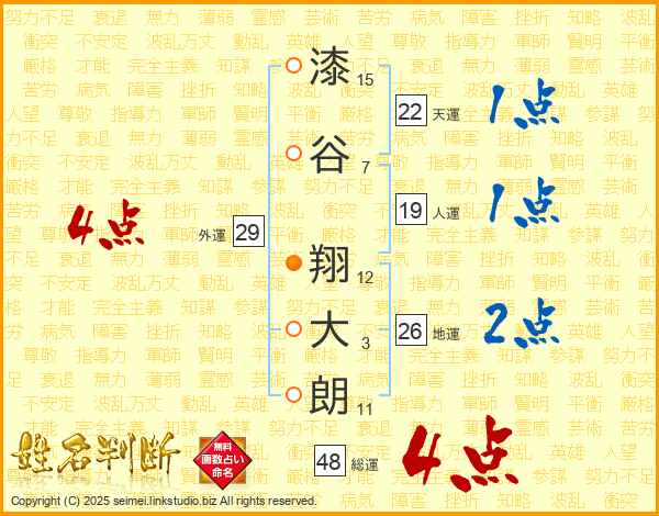 漆(15画)谷(7画) 翔(12画)大(3画)朗(11画)