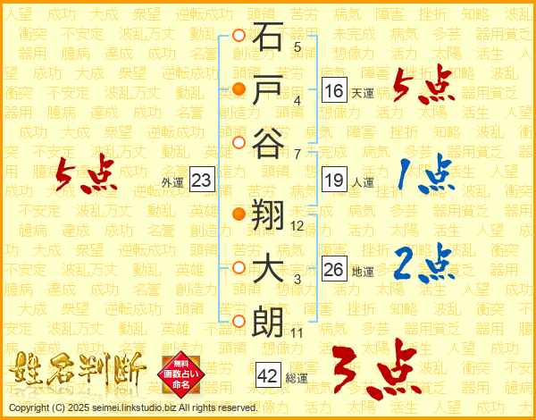 石(5画)戸(4画)谷(7画) 翔(12画)大(3画)朗(11画)