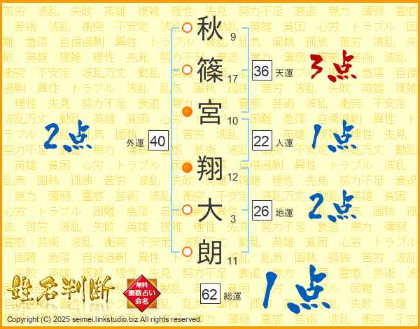 秋(9画)篠(17画)宮(10画) 翔(12画)大(3画)朗(11画)