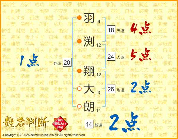 羽(6画)渕(12画) 翔(12画)大(3画)朗(11画)