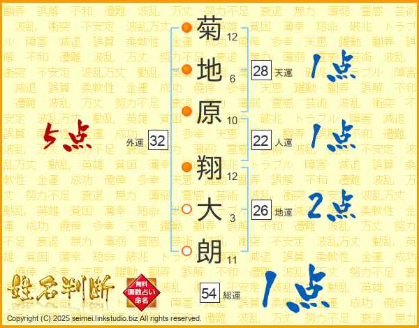 菊(12画)地(6画)原(10画) 翔(12画)大(3画)朗(11画)