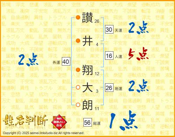 讃(26画)井(4画) 翔(12画)大(3画)朗(11画)