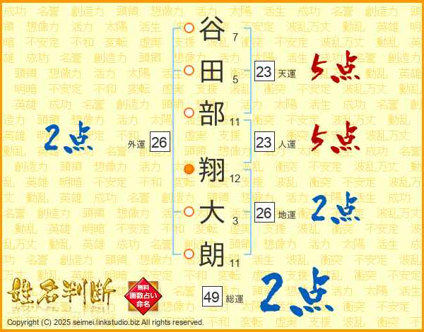 谷(7画)田(5画)部(11画) 翔(12画)大(3画)朗(11画)
