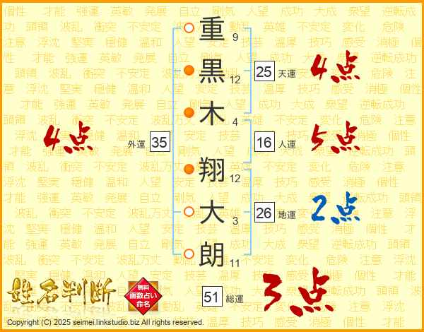 重(9画)黒(12画)木(4画) 翔(12画)大(3画)朗(11画)