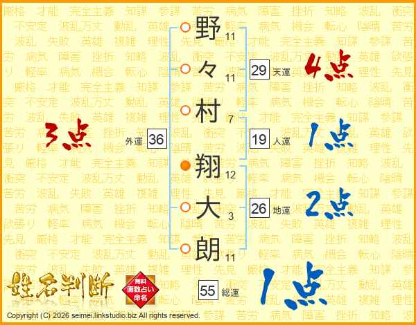 野(11画)々(11画)村(7画) 翔(12画)大(3画)朗(11画)