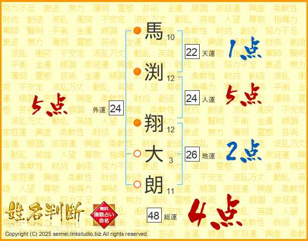 馬(10画)渕(12画) 翔(12画)大(3画)朗(11画)