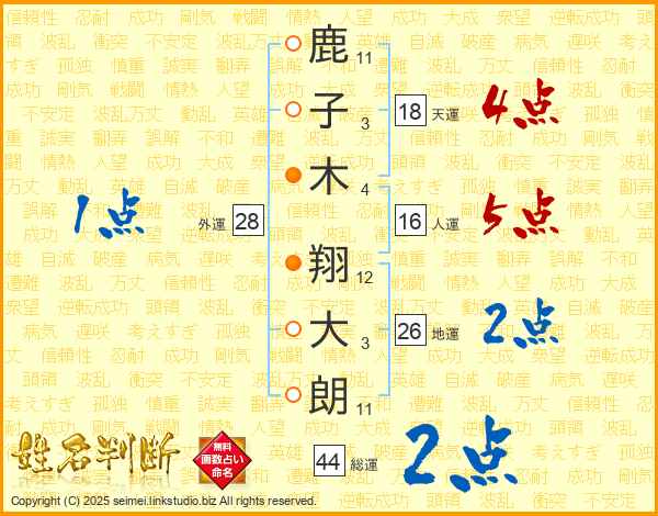 鹿(11画)子(3画)木(4画) 翔(12画)大(3画)朗(11画)