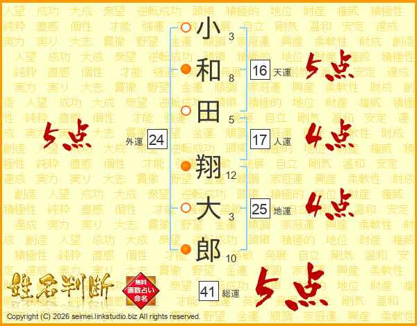 小(3画)和(8画)田(5画) 翔(12画)大(3画)郎(10画)