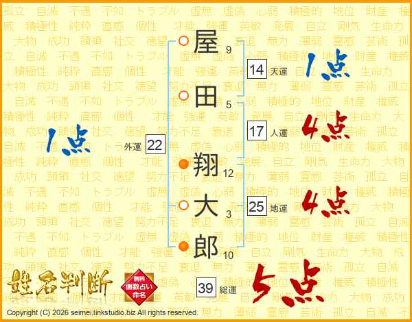 屋(9画)田(5画) 翔(12画)大(3画)郎(10画)