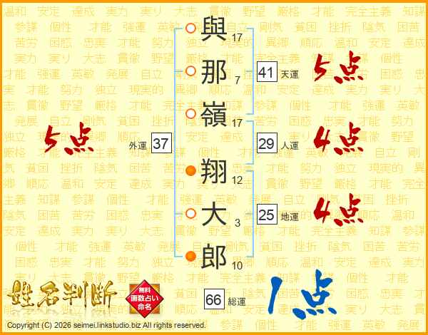 與(17画)那(7画)嶺(17画) 翔(12画)大(3画)郎(10画)