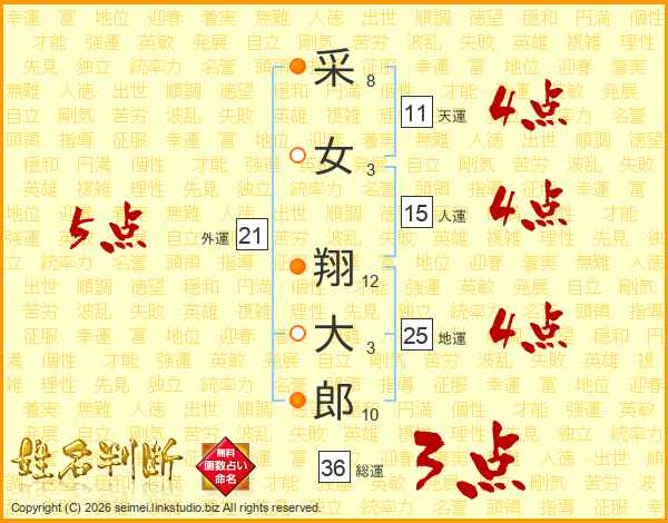 采(8画)女(3画) 翔(12画)大(3画)郎(10画)