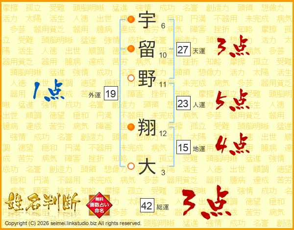 宇(6画)留(10画)野(11画) 翔(12画)大(3画)