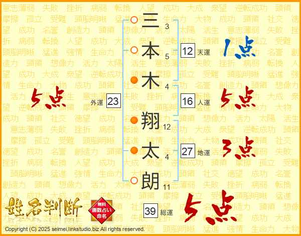 三(3画)本(5画)木(4画) 翔(12画)太(4画)朗(11画)
