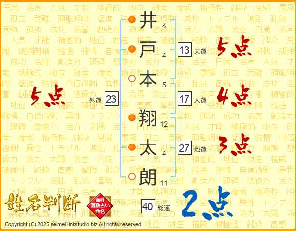 井(4画)戸(4画)本(5画) 翔(12画)太(4画)朗(11画)