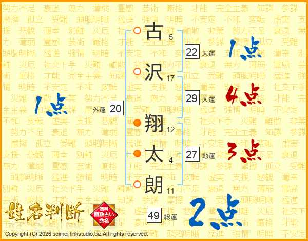 古(5画)沢(17画) 翔(12画)太(4画)朗(11画)
