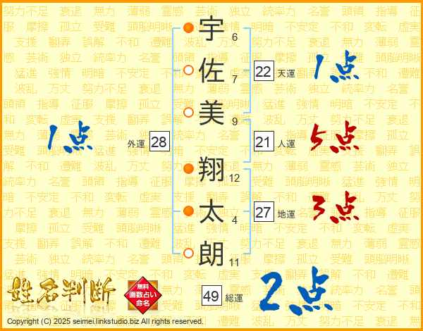 宇(6画)佐(7画)美(9画) 翔(12画)太(4画)朗(11画)