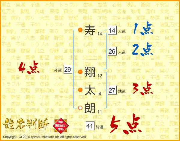寿(14画) 翔(12画)太(4画)朗(11画)