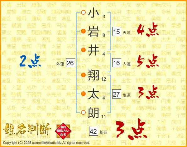 小(3画)岩(8画)井(4画) 翔(12画)太(4画)朗(11画)