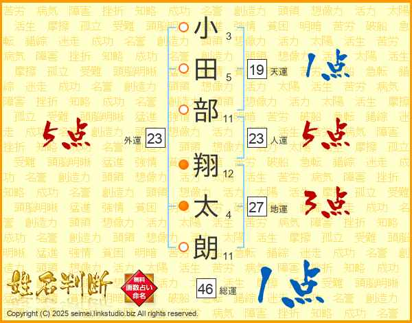 小(3画)田(5画)部(11画) 翔(12画)太(4画)朗(11画)