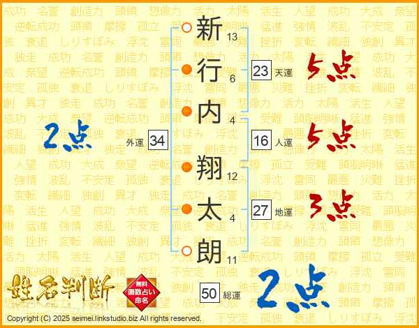 新(13画)行(6画)内(4画) 翔(12画)太(4画)朗(11画)
