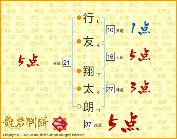 行(6画)友(4画) 翔(12画)太(4画)朗(11画)