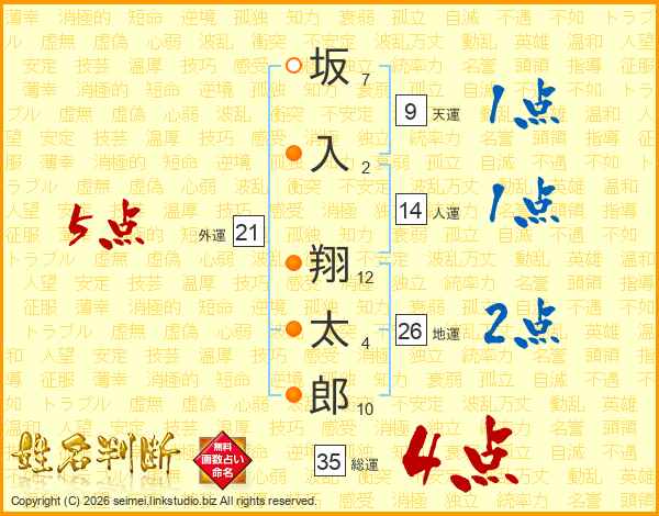 坂(7画)入(2画) 翔(12画)太(4画)郎(10画)