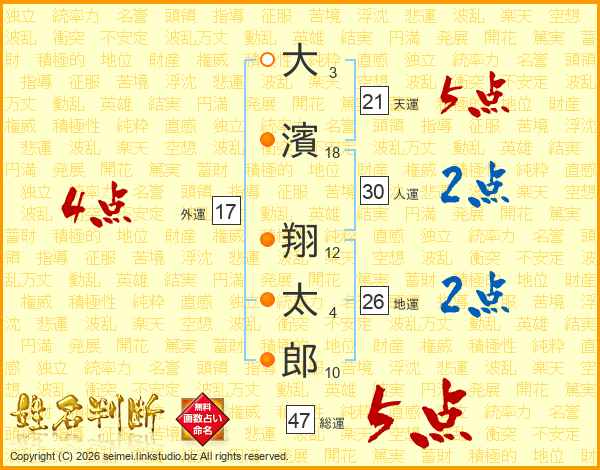 大(3画)濱(18画) 翔(12画)太(4画)郎(10画)