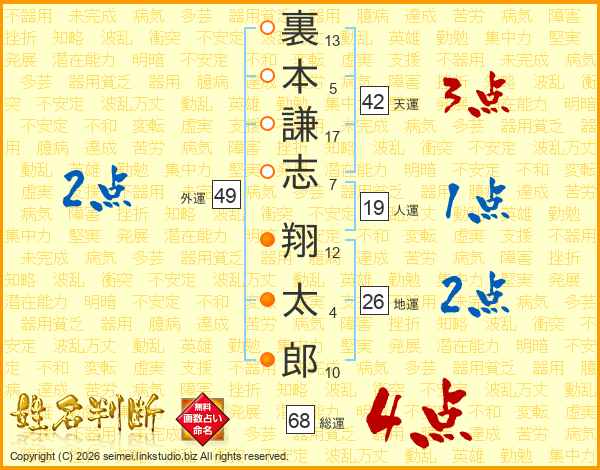 裏(13画)本(5画)謙(17画)志(7画) 翔(12画)太(4画)郎(10画)