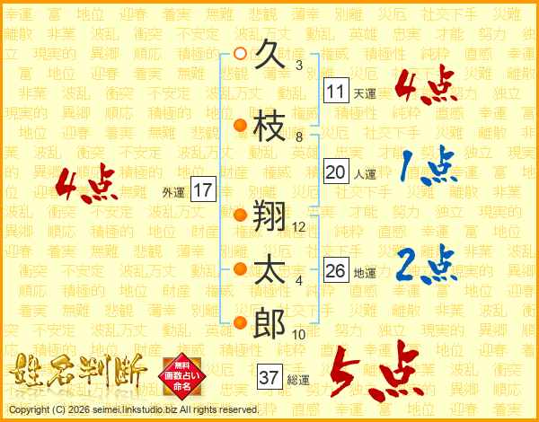 久枝翔太郎さんの総運は37画の5点!