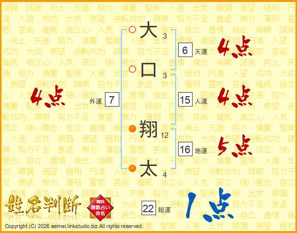 あなたの人生を表す1番重要な運勢です。生涯を通じて影響する総合運となり、主に50歳以降の晩年期に影響を及ぼします。苗字と名前の合計画数。