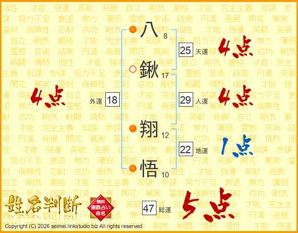 八(8画)鍬(17画) 翔(12画)悟(10画)