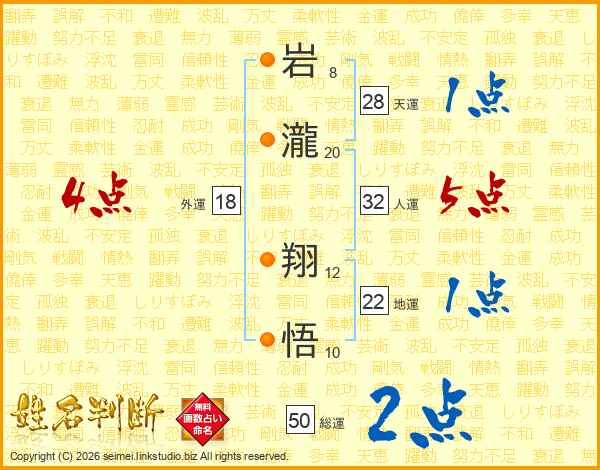 岩(8画)瀧(20画) 翔(12画)悟(10画)