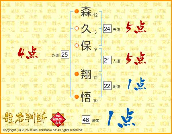森(12画)久(3画)保(9画) 翔(12画)悟(10画)