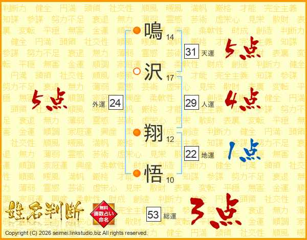 鳴沢翔悟さんの総運は53画の3点!