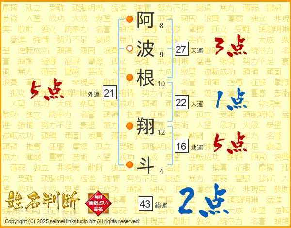 阿波根翔斗さんの総運は43画の2点!