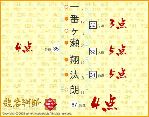 一番ヶ瀬翔汰朗さんの総運は67画の4点!