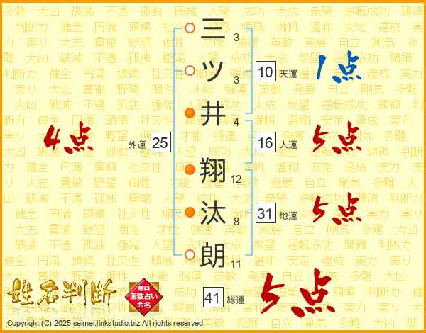 三(3画)ツ(3画)井(4画) 翔(12画)汰(8画)朗(11画)