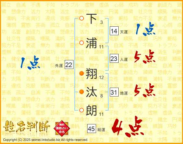 下(3画)浦(11画) 翔(12画)汰(8画)朗(11画)