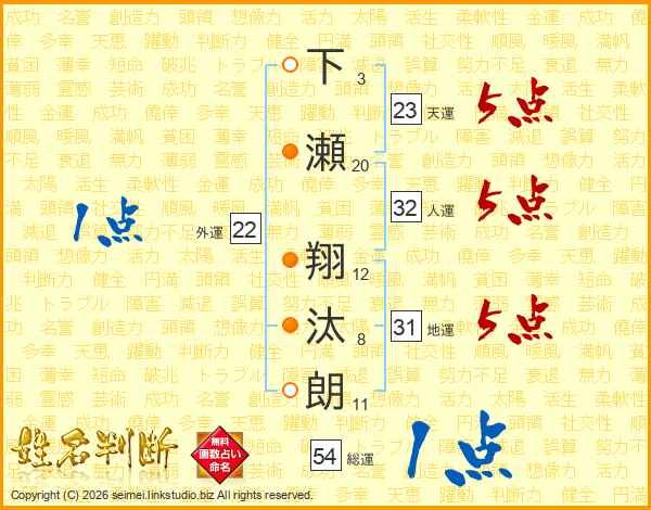 下瀬翔汰朗さんの天運は23画の5点!