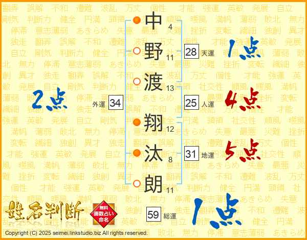 中(4画)野(11画)渡(13画) 翔(12画)汰(8画)朗(11画)