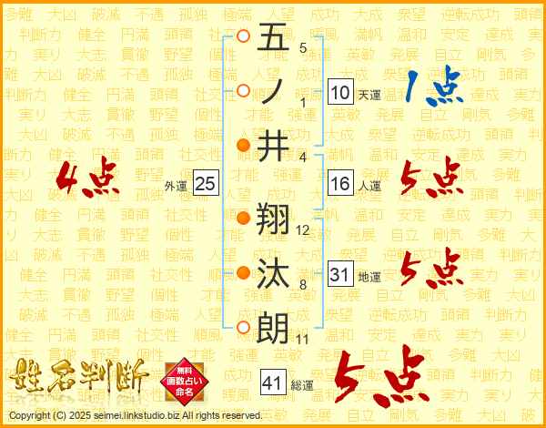 五(5画)ノ(1画)井(4画) 翔(12画)汰(8画)朗(11画)
