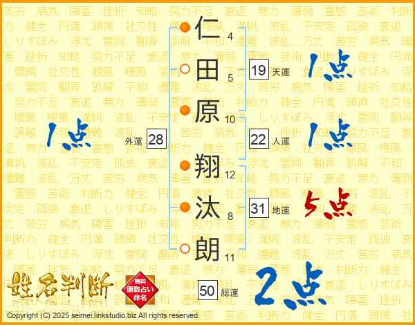 仁(4画)田(5画)原(10画) 翔(12画)汰(8画)朗(11画)