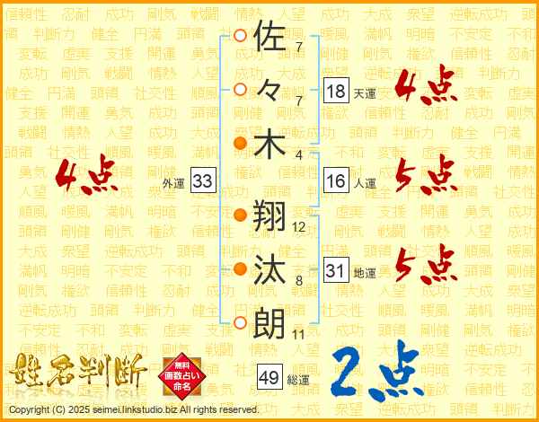 佐(7画)々(7画)木(4画) 翔(12画)汰(8画)朗(11画)